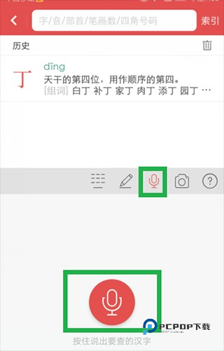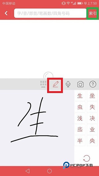4、若您不知其音,还能点红杆的笔状,将它写入左侧灰幕,格中就会浮出,再点即得知字音了。
