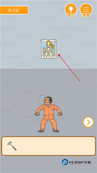 2、第二关,切换场景,拿到锤子后,点击海报将它移开,把锤子拖动到裂缝上砸开墙壁。