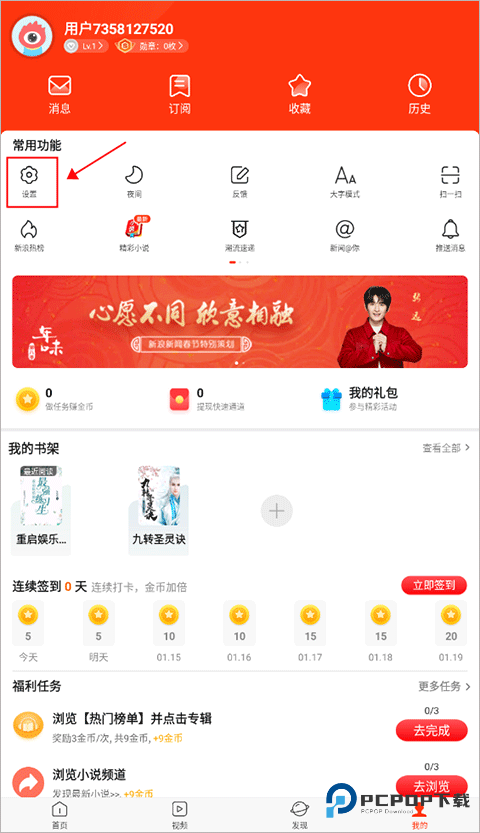 1、首先打开新浪新闻app,在“我的”界面的常用功能下方,点击“设置”选项。