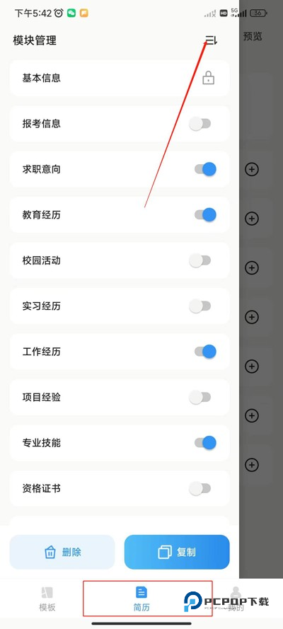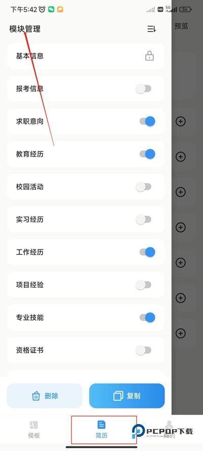 新建简历后默认的模块只是一些常见使用的模块,更多的模块请在:简历-左上角模块管理,可以开启更多的模块