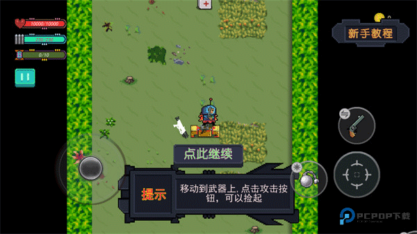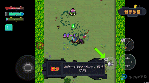 2、进入到游戏后通过滑动游戏左下角的摇杆来控制角色进行移动,滑动右下角的攻击按钮来发射子弹
