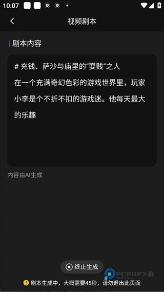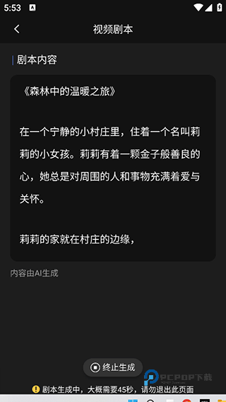 可自动生成视频剧本,生成过程需等待,支持 “终止生成” 操作。
