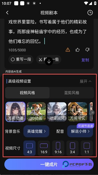 提供视频风格(如万用动漫、3D 动画)、背景音乐、配音、视频尺寸等自定义选项,设置后可点击 “一键成片” 生成故事。