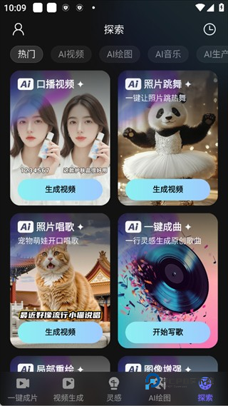 1、探索板块包含:AI 口播视频、照片跳舞、照片唱歌等特色功能,支持一键生成对应内容。
