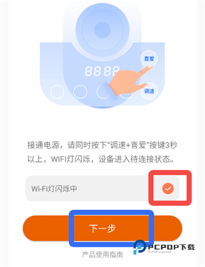 3、将设备连接电源,按下【调速+喜爱】按键3秒以上,看到WIFI灯闪烁,设备进入待连接状态。勾选【Wi-Fi灯闪烁中】,然后点击【下一步】。