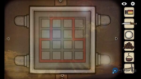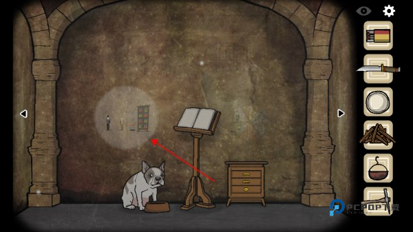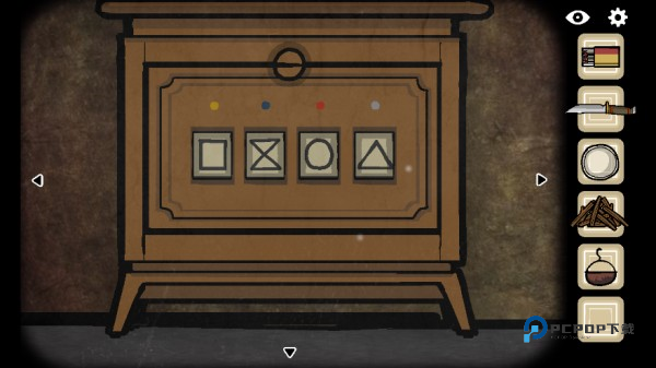 来到对面,完成墙上的解谜(根据石墩上的图形,将柜子上对应的图形移到石墩上即可)