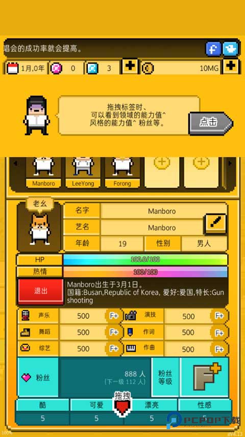 (4)第二步查看成员们之间的能力值,像声乐、舞蹈、演技等。拖拽标签时、可以着到领域的能力值,风格的能力值粉丝等。