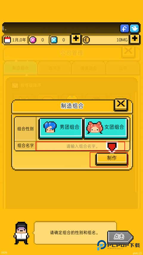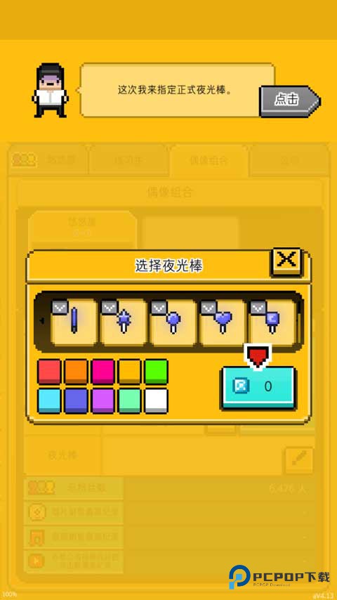 (5)偶像组合,这个就是开始创建粉丝团了,从这里能够获得收入来源。点击下方的笔图标用于创建粉丝团名称,选择夜光棒等,将粉丝积累起来就能获得更多的钱。