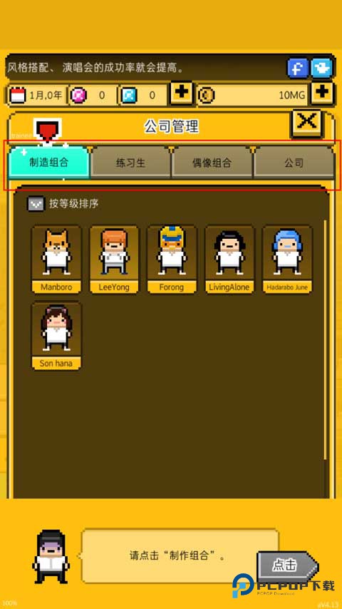 (1)玩家创建好属于自己的公司之后,就可以挑选自己喜欢的练习生打造偶像团体了,在上方的任务按钮进入挑选界面。