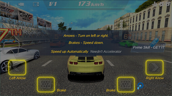 3、进入关卡后,点击左右两侧按钮进行拐弯,屏幕下侧按钮用于刹车(偷偷告诉你:拐弯和刹车按钮一起按可以漂移哦,适用于弯道超车,快去试试吧);