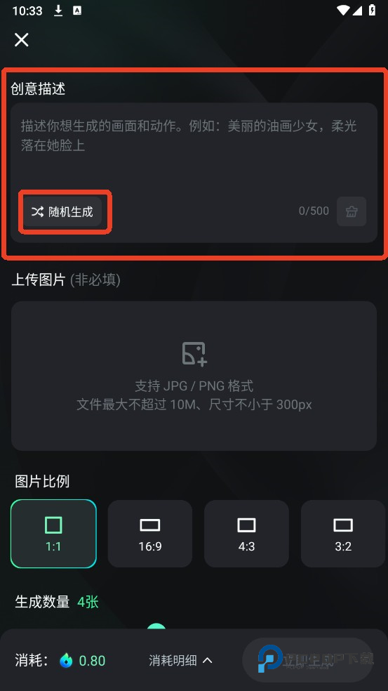 2、输入你想要的描述内容,支持中英文输入,字数不超过500个字符。如果灵感不足,也可以选择随机生成。建议提供详细、清晰的提示词,结构可以按照:“主体+行为、特征、情景、情感+时间+环境+动作+质感、构图、色调、细节”的方式来编写。
