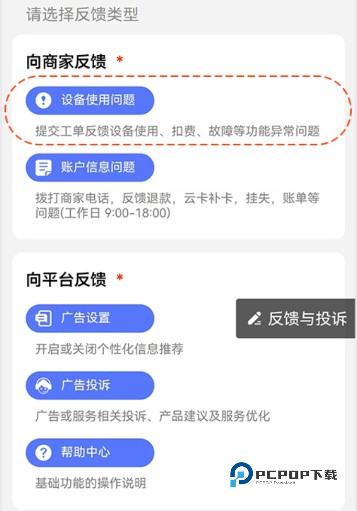 3、选择向商家反馈中的【设备使用问题】
