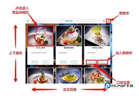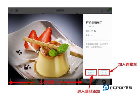 在这里,可以浏览单样菜品,并将菜品放入购物车内。菜品详细页有三种展示方式:默认展示、上下推拉、左右分布,下图为左右分布: