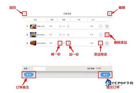 选择完菜品后,所有的选择都会记录在购物车中,在菜单主页及菜品列表页均可进入购物车,界面如下图所示: