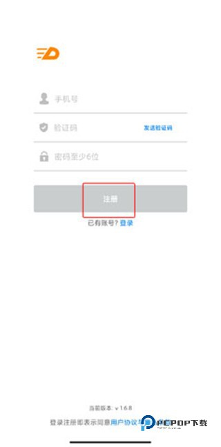 2、用户打开软件之后,系统自动会跳到注册登录页面,输入手机号、验证码之后,点击注册按钮;