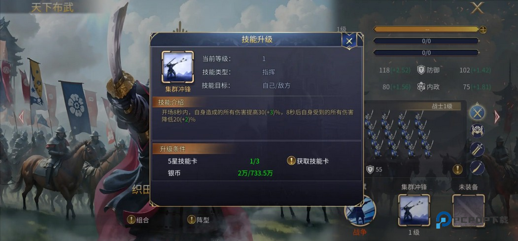 推荐原因:天下布武的技能属于单体技能,只对自身有效,但是数值非常之高!在满级的情况下两项数值分别可达57%和38%,配合武士兵种8秒的时间足够扔出三轮飞矢,对手已经倒下一片了,8秒后即使近身作战,依然可以降低伤害,能扛能打!