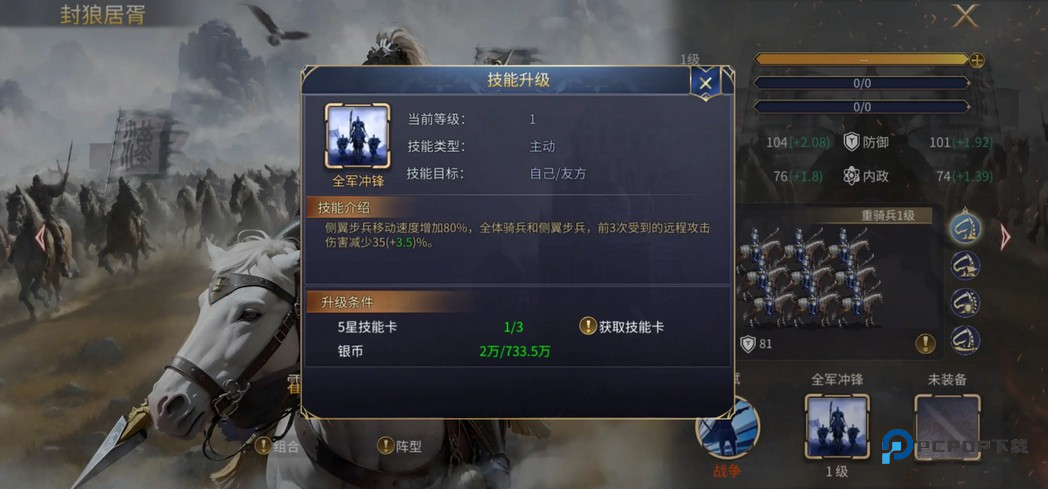 技能:侧翼步兵移动速度增加80%,全体骑兵和侧翼步兵,前3次受到的远程攻击伤害减少35(+3.5)%;满级技能数值可高达66.5%!