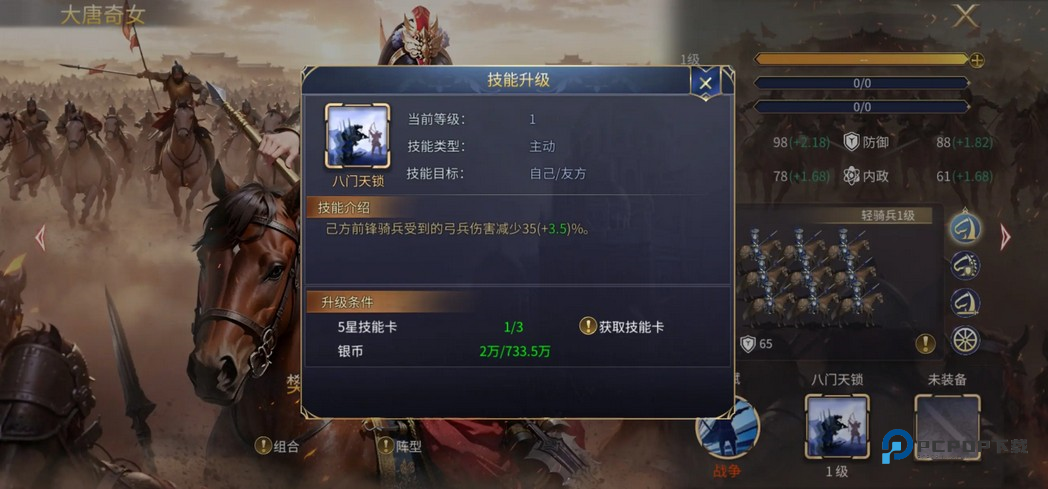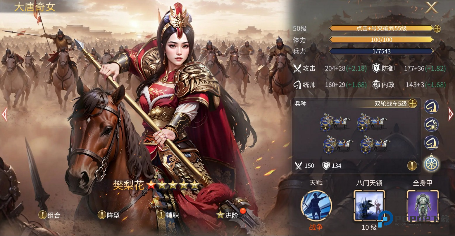 如图,在招到新英雄后,之前的节流就体现出效果,我们很快用积攒的战车兵种卡将樊梨花的兵种升到了5级。