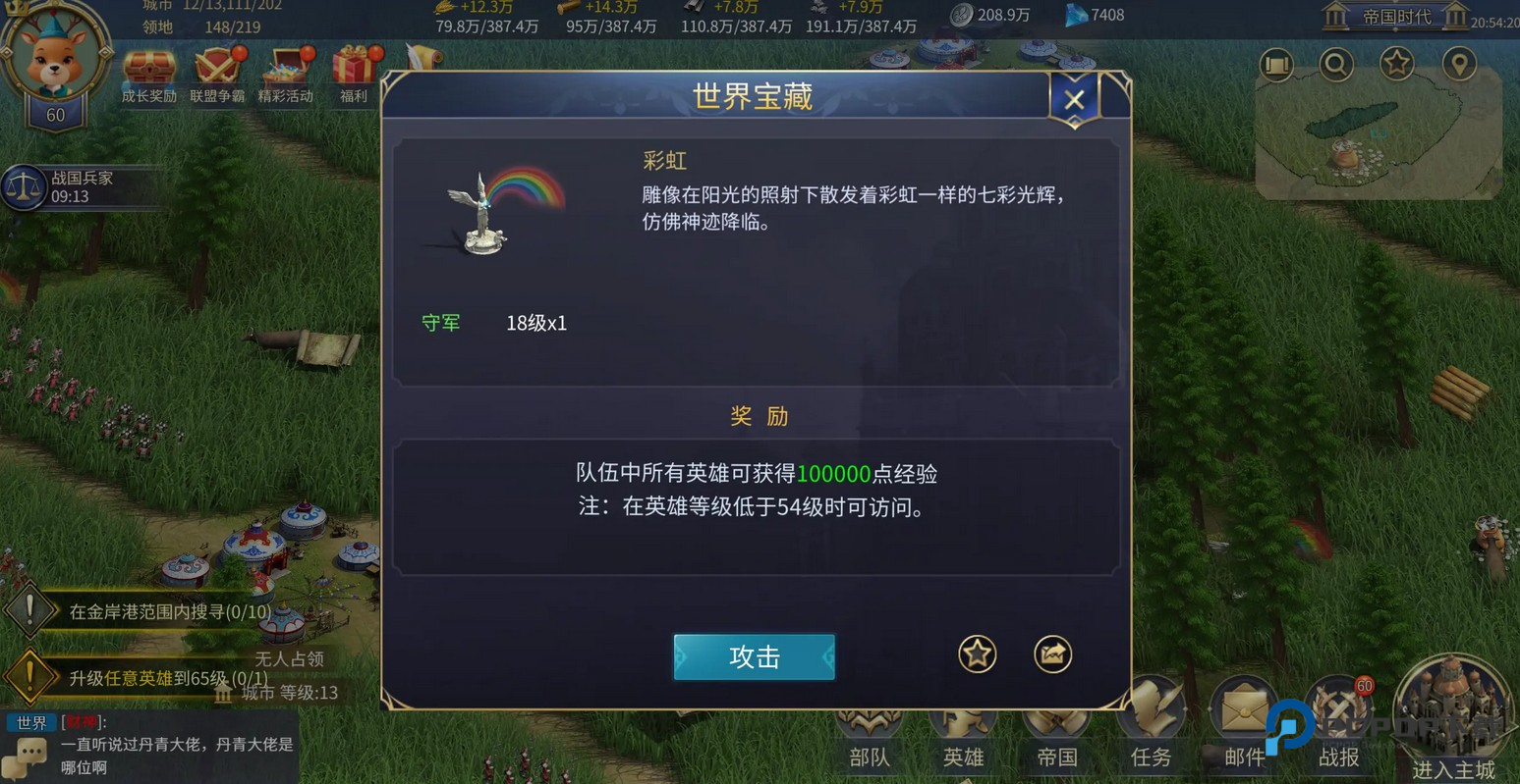 每打一只彩虹,所有英雄获得10万经验,而以我53级英雄为例。