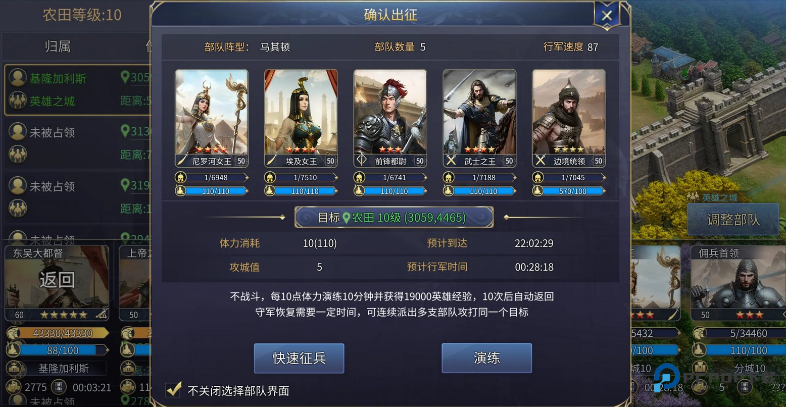 对于并不适合打野的部队,比如骑兵队(策划救救骑兵吧,从18到现在,弱了七年了,七年,人生有几个七年?),强行让它刷怪练级,只会撞得头破血流,损兵折将,英雄没加多少经验呢,兵和资源先打空了。对于他们,演练是个不错的选择。