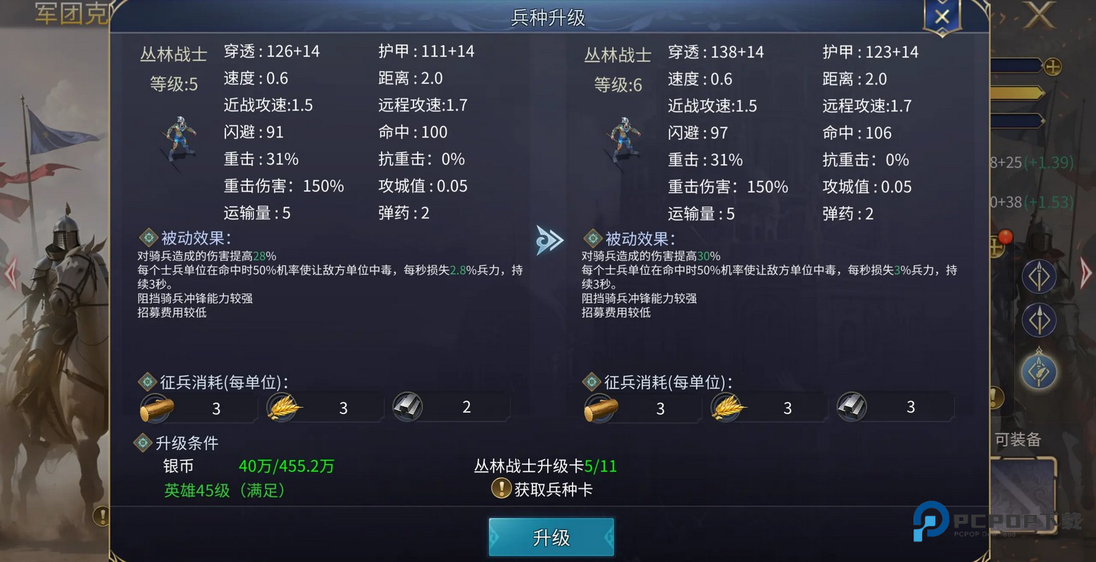 如图中所示兵种每升一级,基础属性提高12穿,12甲,6闪6命;特有的被动效果也得到增强,这些都是很大的提升,要知道六星英雄欧洲之父的技能对群体的加成才是加38点甲,你全部队兵种提升一级的加成几乎可以媲美这样一个强力技能了。