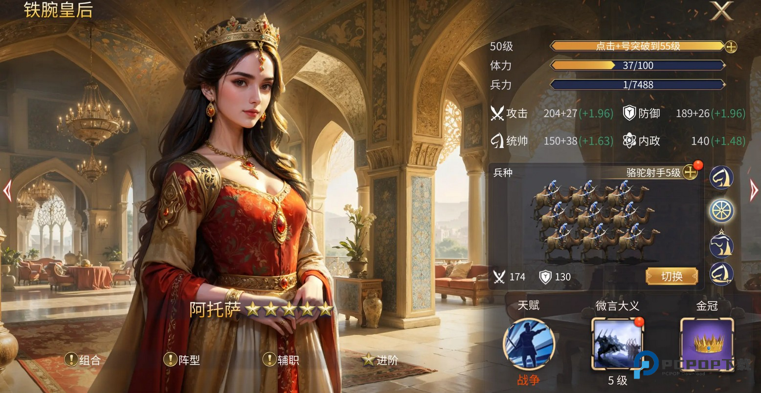 兵种推荐:两个都可以用双轮战车,铁腕皇后也可以使用骆驼射手,这属于远程攻击的轻骑兵,可以起到放风筝的牵制作用,而且敌人接近时还会后退。