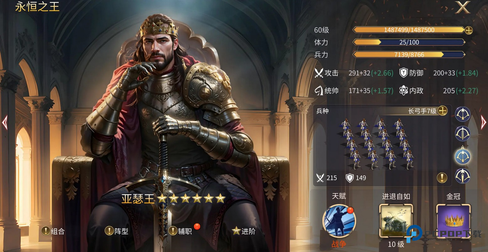 铁腕皇后:受到弓兵的伤害减少30(+3)%,对弓兵和步兵造成的伤害提高30(+3)%,满级技能数值可高达57%。