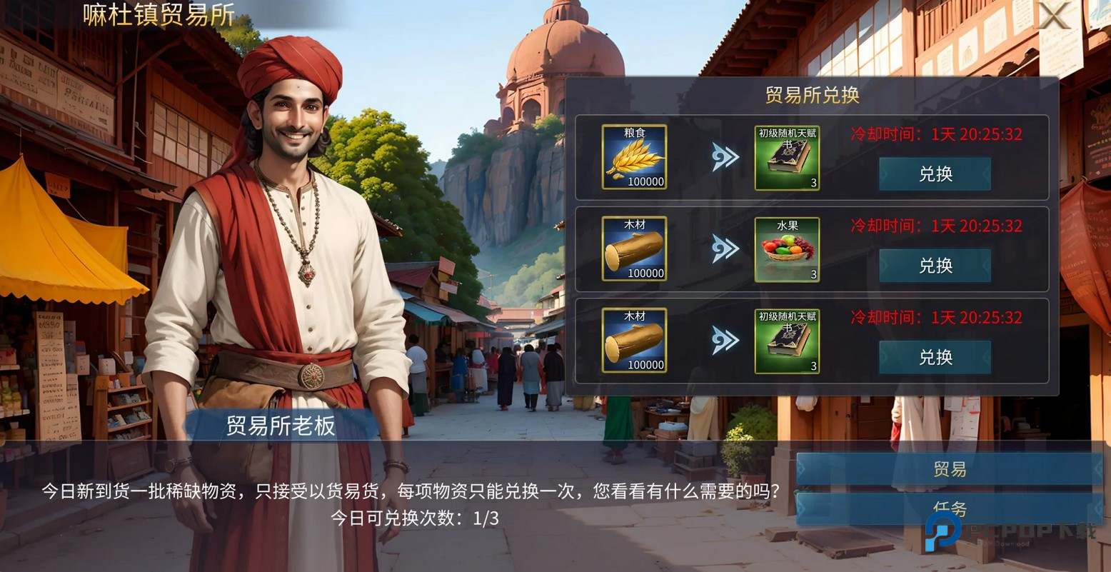 解锁了任务后的贸易所,可以兑换高级水果,CD是三天,每三天可以兑换三种共九颗水果。