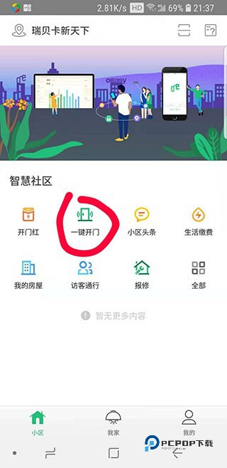 1、“小区”界面,点击“一键开门”5米范围内进行开门。如果您觉得每次还要打开APP麻烦,可以设置快捷键操作。