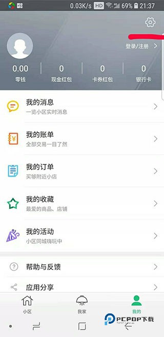 5、返回“1号社区”APP,在“我的”界面选右上角“设置”。