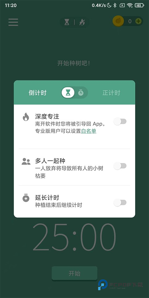 2、点击屏幕上方的漏斗倒计时图标,这里可以进行深度专注、多人一起种、延长计时及正计时模式,具体的模式解释如下图;