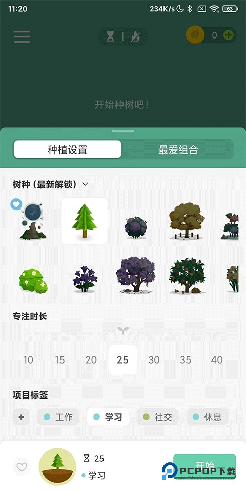 3、接着在点击屏幕中间的小树图标,在这里用户可以选择自己喜欢的小树、花或其他植物进行种植,还有专注时长及项目标签可在此更改;