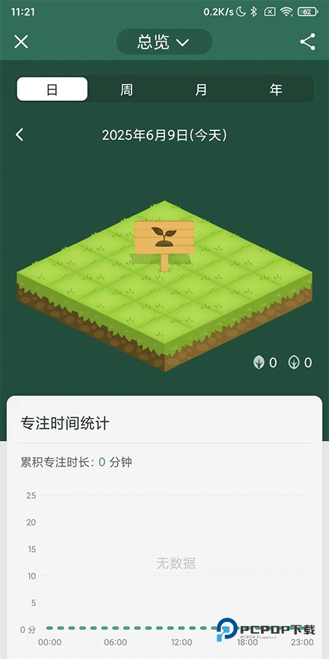 5、点击森林模式,在这里用户可以看到累积的专注时长,树苗成长状况,可按日周月年查看;