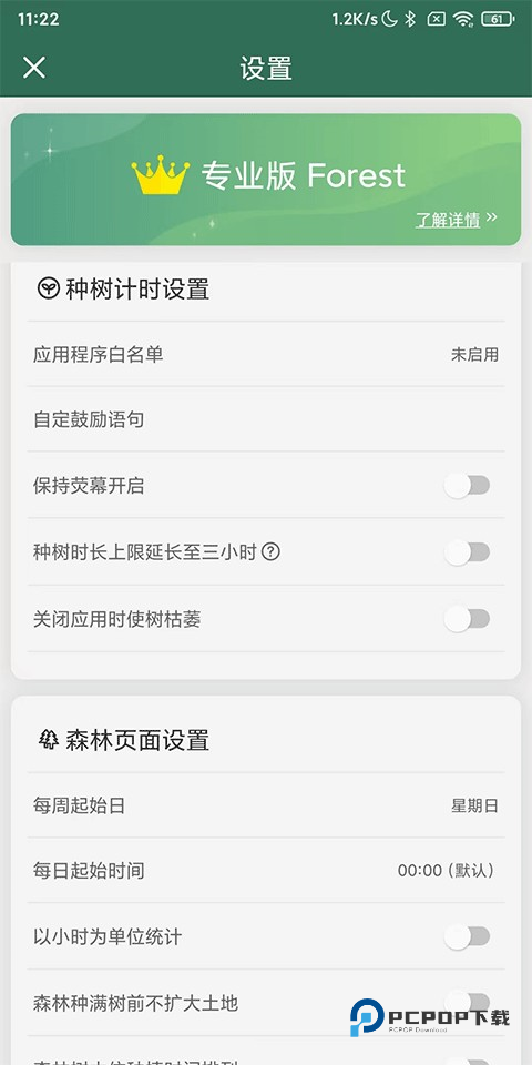 6、点击最下方的设置按钮进入设置对话框,这里包含了种树计时设置、森林页面设置等众多偏好设置,用户可根据喜好习惯自定义;