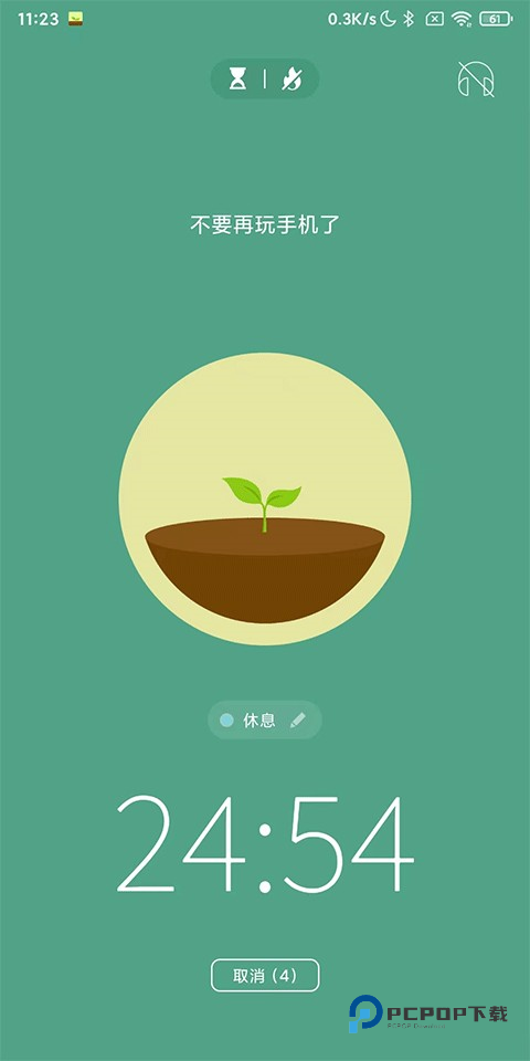 1、在本站下载forest专注森林后并打开,映入眼帘的是一棵小树和下方的时间倒计时;
