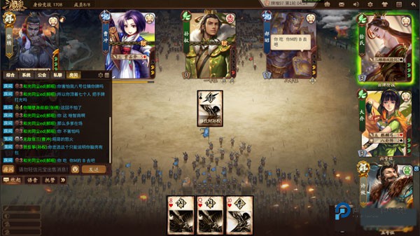 3、选择完角色之后,玩家获得系统随机给予的卡牌,通过卡牌的角逐来判定胜负。卡牌的数量一般分为几种,分别是锦囊、杀、闪以及血量回复,