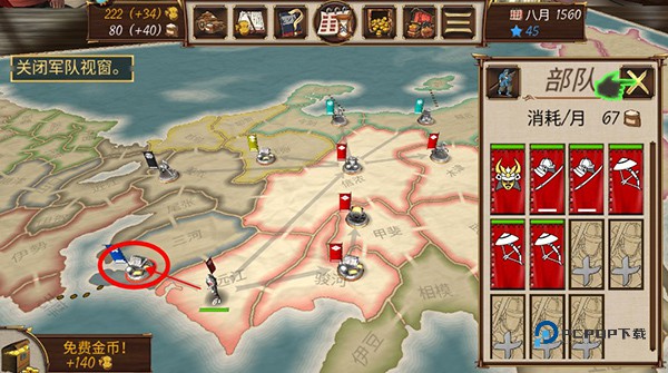 2、这里拿北条举例,开局换好将以后立马进攻武田的武藏,下一回合再回头拿下甲斐,到这里呢差不多开局就算成功了,然后需要做的就很简单了,一直开发自己的领地到满级为止,期间不断炒粮,和周边的势力结盟通商,对方撕毁盟约你下回合马上去结盟,简单说就是不打仗,升级本势力的独有技能就是500块升级一次的那3个技能,都升满,然后攒好兵打斋藤,伊达,上杉,德川从右往左就行了。