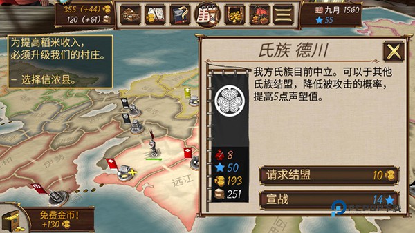 1、经济外交,兵不血刃,选择日本历史上的十五个氏族之一,体验战役,攻城掠地,解锁单位,巩固势力范围。