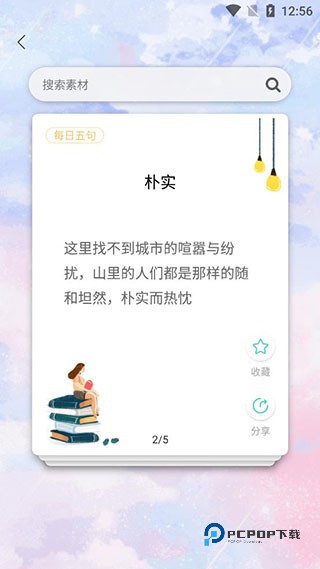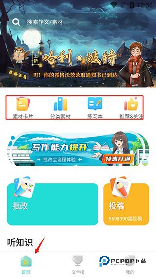 2、在首页可以看到有素材卡片、分类素材、练习本和推荐关注;