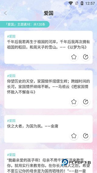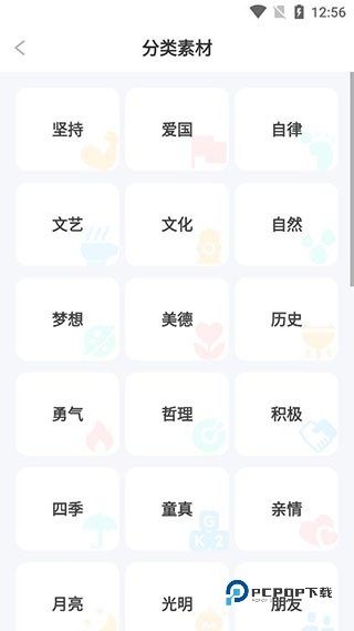 4、在素材分类可以看到有各种词语分类,比如关于坚持、爱国、自律、文艺、文化、自然、梦想、美德、历史等等;