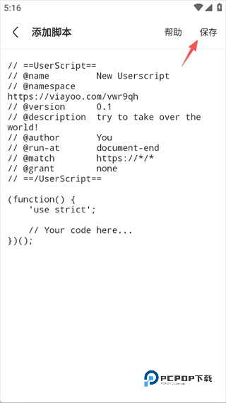 4、如果选择【添加脚本】,在弹出的输入框中粘贴代码,然后点击右上角的保存按钮。