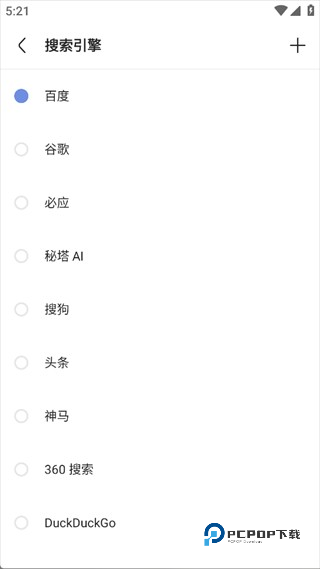 4、点击【搜索引擎】选项,进入列表后勾选你想要的搜索引擎(如百度、谷歌、必应等),设置将立即生效。