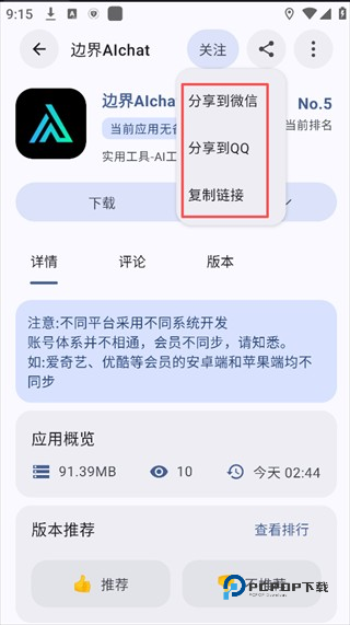 3、点击分享按钮即可弹出分享弹窗。你可以选择通过微信、QQ或复制链接这三种方式分享应用。