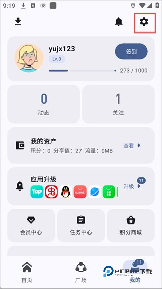1、打开AppShare手机版,进入【我的】页面,点击右上角的齿轮图标,进入设置中心。