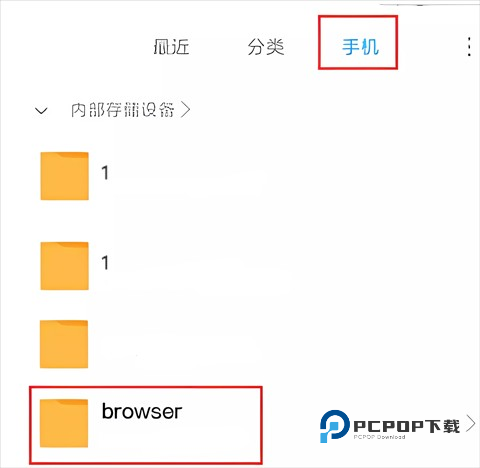 4、如果想要找文件的存储位置,那么我们接着打开手机中的文件管理器,切换到“手机”分类,在其中找到文件夹“browser”,这是浏览器的存储文件夹。
