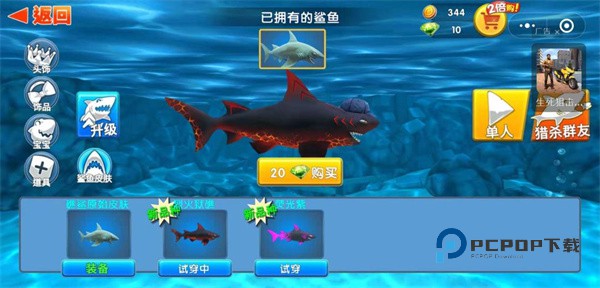 4、完成50个任务,寻找宝物取得金币与宝石,用来升级你的鲨鱼或者购买特殊救生道具;