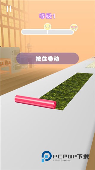 2、进入游戏后,持续按住屏幕,让寿司卷进行滚动;