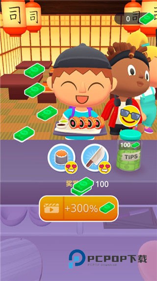 4、制作完成送上美味寿司可获得奖励,点击笑脸表情包还可获得额外奖励;