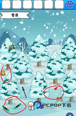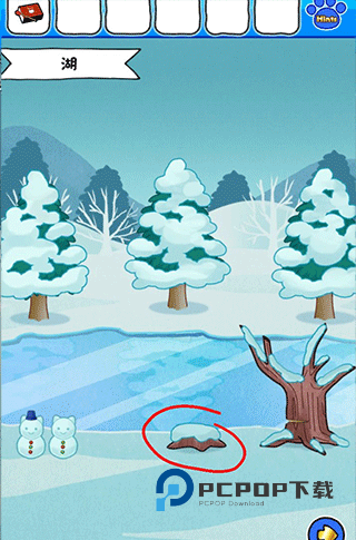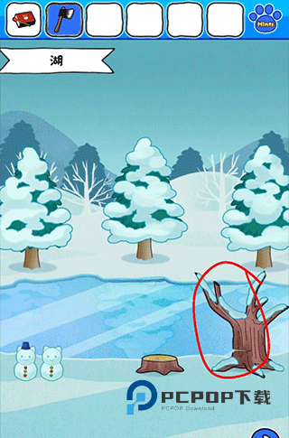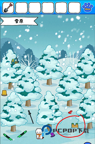 2、利用“铲子”铲开旁边的雪堆,解救猫老大,而猫老大则会将【洞窟前】的雪人推开,解锁新地图~