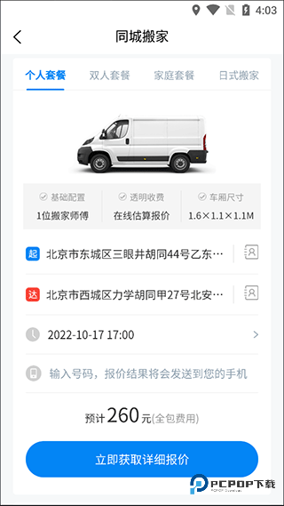 2、按照自己的搬家需求选择进入,填写起点和送达地点的信息,选择预约搬家的时间,最后输入手机号即可获得报价;